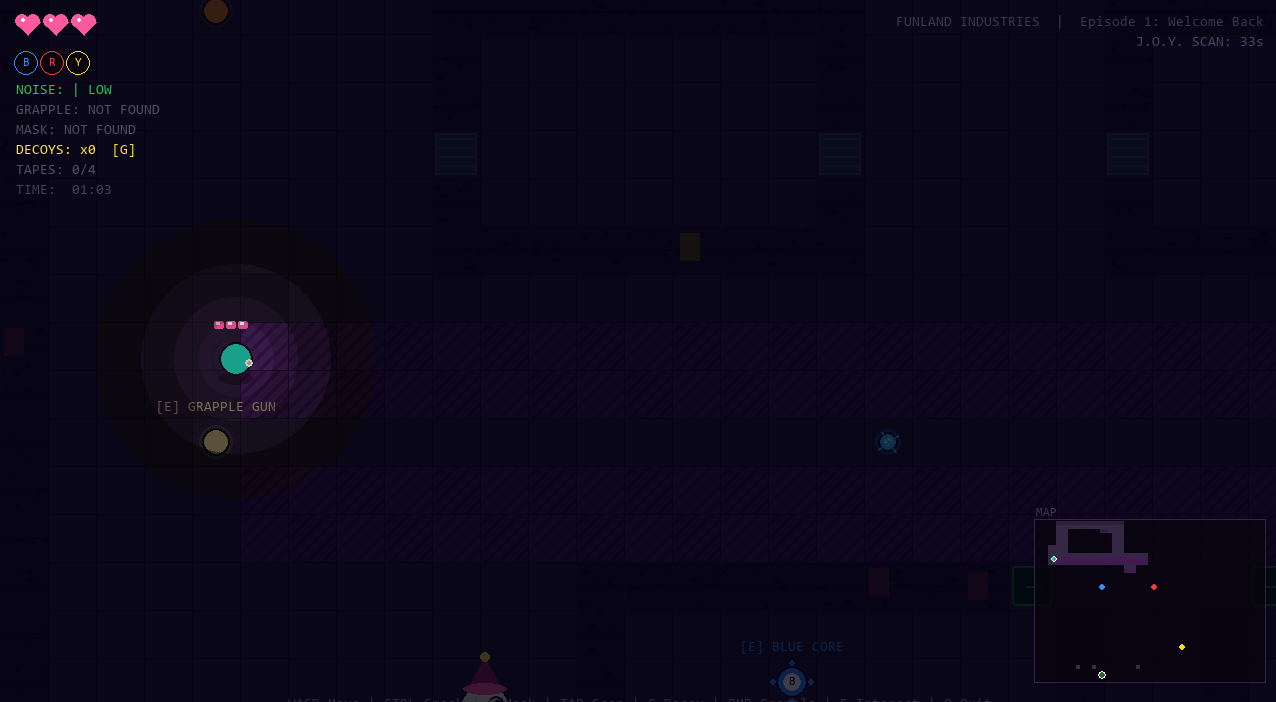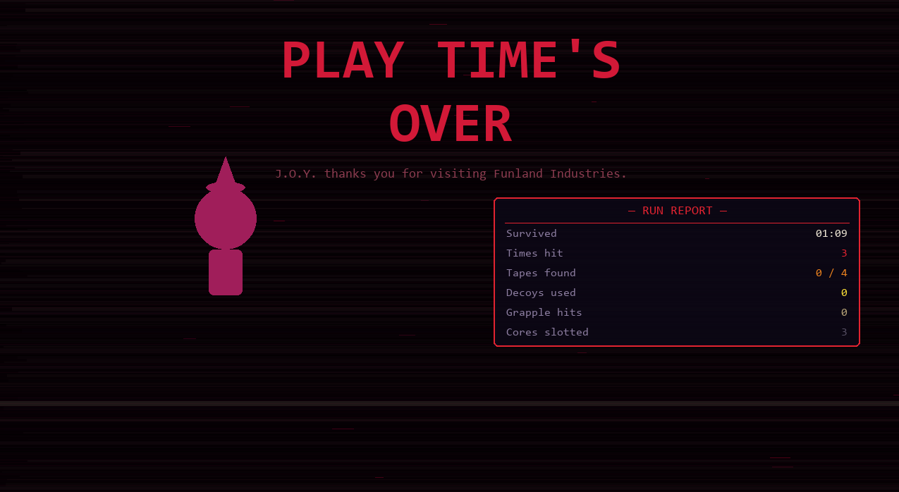 - Escalating difficulty — each core you slot makes enemies faster and shortens J.O.Y.'s broadcast interval