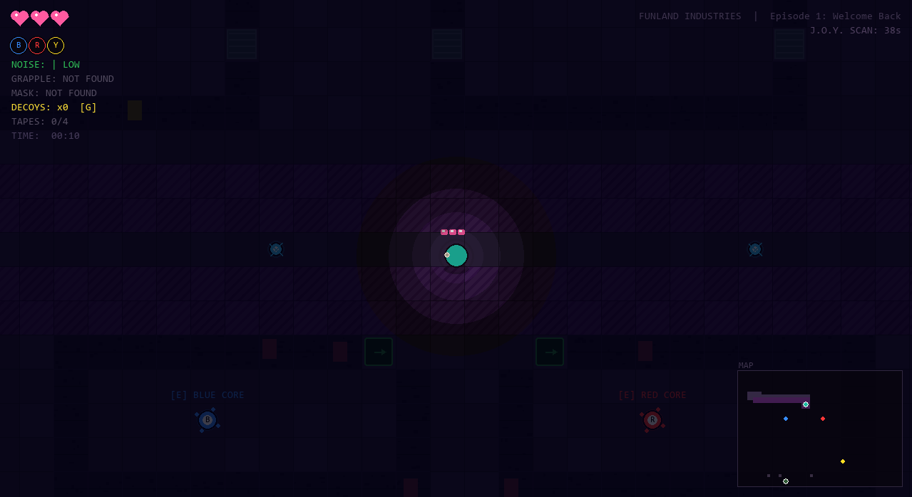 J.O.Y., the facility's central AI, has sealed every exit. To escape, you need to find three power cores hidden deep in the building and slot them into terminals that will restore power to the gate. That means crossing the factory floor. That means getting close to them.